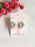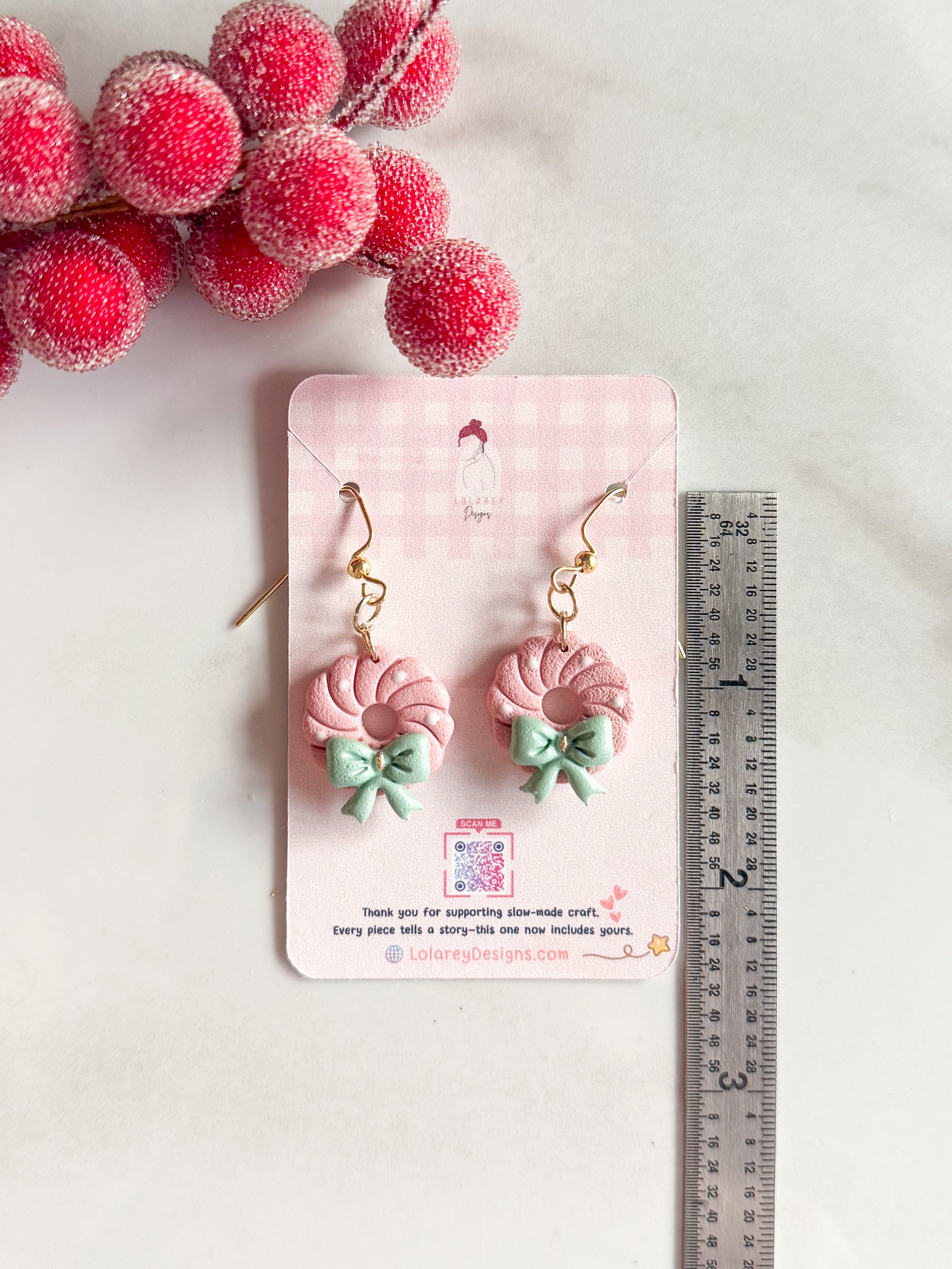 Festive Dainty little wreath with bows dangle earrings. Choose from 3 colors: Pastel Pink, Mint green, or Evergreen.