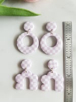 Pastel purple in checkered print (circle and arch). Nickel free-Gold plated posts.